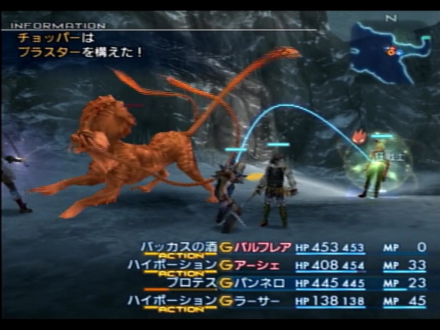 この戦闘のメンバーはバルフレア&アーシェ&パンネロ&ラーサーです。このうち、バルフレアがいつも通り狂戦士状態で攻撃を行い、パンネロがメンバーにプロテスを配ったり回復を行ったりし、アーシェとラーサーがハイポーションによるメンバーの回復を行います。この通りだいぶ回復に偏重した戦術になっていますが、これにはチョッパーの攻撃力と特技の「ブラスター」が理由として挙げられます。