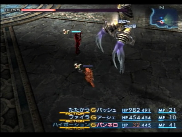 続いてアーシェを起用した理由ですが、これは途中でアーリマンが使用する「分裂」で出現する分身を効率的に倒すためです。分身は最大5体ほど出現する為、バッシュの攻撃だけではすぐに倒しきれず、盾役のパンネロがあっという間にやられてしまう危険性が高くなります。そのため範囲攻撃を利用して一気にダメージを与えていきたいところですが、範囲攻撃は基本的に魔法かわざを使用するしかありません。わざはまともにダメージを与えられる範囲攻撃が少ないので、安定したダメージを与えたいのであれば魔法を使用することになります。アーシェはパーティ内で魔力が最も高いので、分身(HP700)が現れたら彼女に「5.HP<1000の敵 -> ファイラ」で攻撃してもらいます。ただし、装備品が店売りであること、後述の理由でHPを上げる必要がある事から、装備で思うように魔力を上げることが出来ないので、分身を倒しきれない可能性があります。その時は狂戦士状態のバッシュに残りを片づけてもらうようにします。また、分身を倒す以外にも、前述のとおり攻撃力の低いボウガンの火力を補う形で普段からアーリマン本体に「ファイラ」を唱えます。