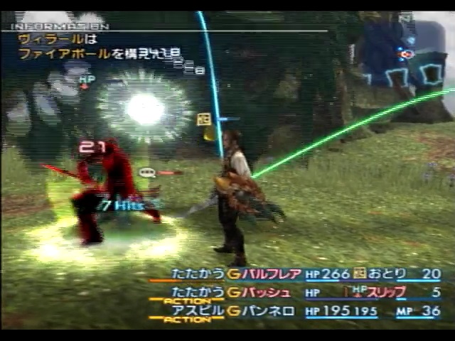 ――そんな感じでヴィラールのHPを減らしていくと、HPが半分を切ったあたりでヴィラールが遠くに逃亡し、「治療」を使ってHPを回復します。逃亡するときにヴィラールはこちらの足止めとして「ドンムブガ」を使用することがあるのですが、事前に沈黙状態にしておけば使用されません。ヴィラールが逃亡したらこちらも負けじと追いかけていきます。この時アザーメンバーとしてヴィラール戦に参加している旅のヴィエラを眠らせたりしていなければ彼女がヴィラールの後を追いかけていくので、見失ったときは彼女についていけばよいでしょう。