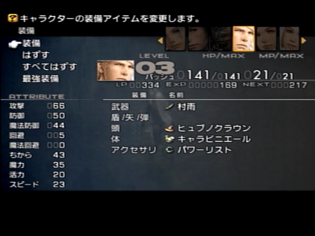 そしてエアロガを唱える役は最大MPの最も高いパンネロです。パンネロは魔装備を装備して、エアロガのほかにもヴィラールへのブライン、サイレス、念押しのバルフレアへのデコイを唱えます。また、MPがなくなったら連撃による「加ダメージチャージ」でMPを持て余しているバッシュからMPを回収します。