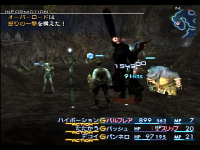 そんなこんなで、オーバーロードに対してもこれまで通り超瀕死連撃を使って攻略していきました。これまでの戦法を踏襲し、バルフレアが自身に「プロテス」を張りつつ「バランス」や「針千本」で攻撃をひきつけ、パンネロがバルフレアへのデコイやオーバーロードへのブライン&スロウを使用し、先に述べた通りバッシュが瀕死+バーサク状態になり敵の弱点を突ける村雨で連撃を繰り出していきました。敵のHPは6万程度と低いため、「瀕死防御力UP」に阻まれながらもサクサクとHPを削っていくことができました。ちなみにこの戦闘で参加するモテたいシークは、運よく生き延びることができました。