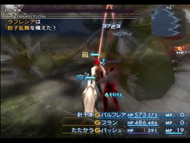 以上のことを踏まえて、( ^o^)<「ラフレシアもエアリアルの超瀕死連撃で攻略できるんじゃね?」と判断し、戦闘前に盾役かつマイナス必中役のバルフレアにデコイをかけ、連撃役のバッシュをブレイブ+狂戦士+超瀕死状態のフル強化状態にしておきました。そして、もう一人のマイナス必中役であるフランを投入し、いざラフレシア戦へと臨んだところ、開幕でバッシュが一発当たり4000前後の攻撃で11連撃を叩き出し、バルフレアとフランがくらやみ+沈黙にし終えて間もなくバッシュが再び6連撃を叩き出して戦闘が終了してしまいました。戦闘時間は20秒ほどでしょうか。今までのプレイでは使用した覚えのなかったエアリアルですが、こんなに強かったとは……