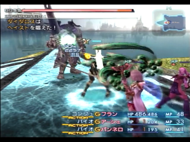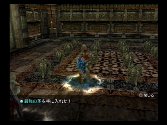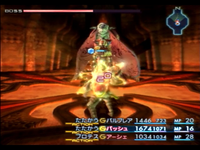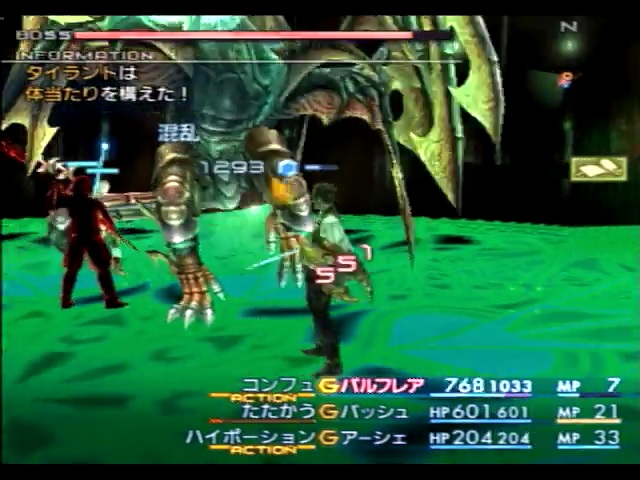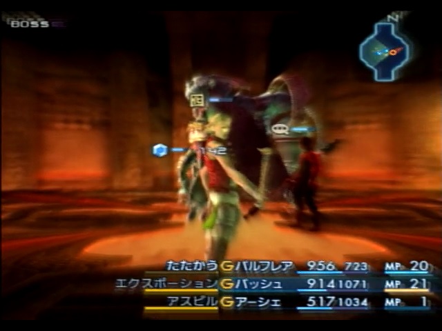 それではどうやって戦ったのかというと、「混乱を使用して敵の行動を妨害しつつ肉弾戦を仕掛ける」という戦法に落ち着きました。その内容は、バルフレアがおとり状態になりながら敵対心変動の大きい「コンフュ」を唱え、その傍らで狂戦士状態になったバッシュが氷属性を持つトライデント(持っていなかったので一度港町バーフォンハイムまで逆走しました)で攻撃し、アーシェがバルフレアにデコイを唱えたり、HPの減った味方に回復アイテムを使用したりといったサポートをしつつ暇になったら混乱の追加効果を持つ錯乱のメイス(持っていなかったので一度帝都アルケイディスまでry)で殴り掛かるというものです。また、デコイをかけられるバルフレア以外は、ルビーの指輪でリフレク状態になり相手の魔法攻撃を反射します。なお、「コンフュ」を唱えるバルフレアはMPがなくなったら氷属性を持つアイスブランドで攻撃し、「加ダメージチャージ」でMPを回収します。