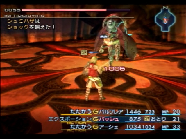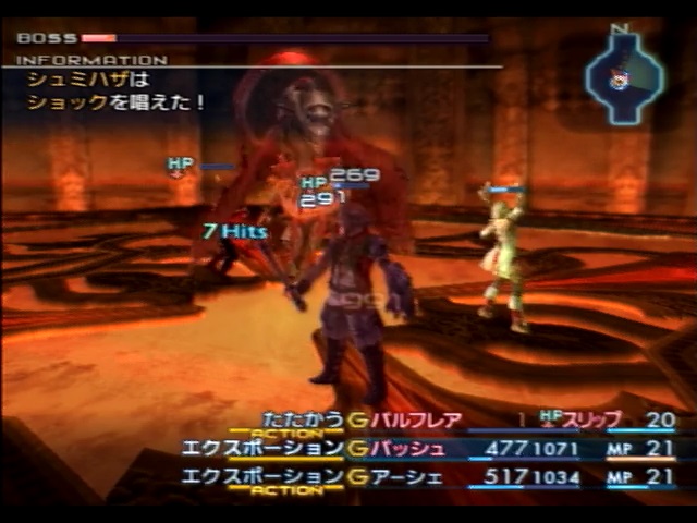 さて、支援役のアーシェは、「プロテス」などを唱えるわけですが、当然MPがなくなっていきます。どうやってMPを回復するのかというと、死の天使ザルエラ戦の時と同じく「たたかう」で殴ってMPを回収します。最初は「アスピル」でバルフレアあたりからMPを吸い取ろうとしたのですが、バルフレアはバッシュによってシェル状態になるため、アーシェのフェイス状態が切れている時などにミスをする可能性があります。また敵の攻撃が激しく、アスピルの硬直中に仲間が倒されるという事態が発生したので、ザルエラ戦と同様にモーションの短い「たたかう」でちまちまと攻撃しMPを回収していきます。MPがすっからかんに近い時だけ「10.バルフレア -> アスピル」で一気にMPを回収するようにしました。