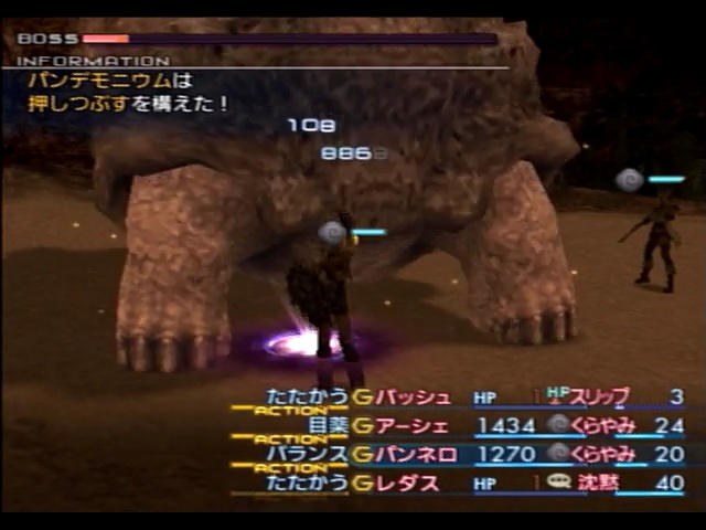 敵のターゲット決定方法として、HPが50%以上ある場合は最も近い敵を、HPが50%未満の時は敵対心が最も高い敵を狙ってきます。ですので、パンネロは前半は敵に接近してターゲットを集め、後半は敵対心変動の大きい「バランス」をひたすら撃って敵対心を稼ぎます。また、HPが50%未満になったときに使用する「絶対防御」は、パンデモニウムの場合は敵対心が一定以上になったキャラクターがいる場合に即座に解除されるため、「バランス」を2〜3回使用すれば敵の「絶対防御」をすぐに解除することもできます。また、攻撃役のバッシュは、敵に接近して狙われないように両手弓による遠隔攻撃で攻撃します。レダスは武器の性質上基本的に近接攻撃しかできないので、彼が狙われたときは回避を期待するか諦めて蘇生しましょう。そんな感じで、パンデモニウムを撃破することが出来ました。ここまで書いて、遠隔武器を装備したゲストメンバーがいても良かったんじゃないかと思いました。