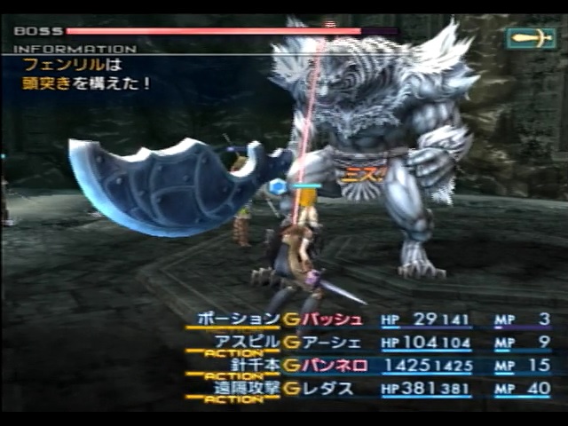 ちなみに、フェンリルには睡眠が有効なので、「スリプル」をかけて「バイオ」をデルタアタックすればかなり楽に倒す事ができます。しかし、その戦法を採用してしまうと諸々の事情でレダスの存在が邪魔になってしまい、レダスを放置する必要があるので今回はその戦法は採用できませんでした。