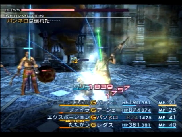 そして敵のHPを30%未満まで削ると、いよいよ敵は「通常攻撃CT0」「魔法CT0」を得ます。こうなるとアントリオンの恐怖の再来となり、バッシュがハイドロの猛攻を受け続けることになります。一応、敵は足が遅いので頑張ればマラソン戦法で敵の攻撃から逃れることも可能ではあるのですが、ここまでガンビット任せにしているためほぼ確実に通路の端に追い込まれている状態になっており、十分な距離をとることが出来ません。また、敵は「通常攻撃CT0」「魔法CT0」を得て瞬時に攻撃を繰り出してくるため、十分な距離をとる前にアクションを実行され、その硬直時間中に離れたせいで敵の感知範囲から離れてしまい、近くで攻撃しているキャラクターが狙われ、再び瞬時に攻撃を繰り出され……という悪循環に陥りやすいです。要するにこの状況下ではマラソン戦法を取るのが難しいため、敵の猛攻に正面から耐えることにします。敵が連撃さえ繰り出してこなければ、回復はエクスポーションで追い付くので、その間にバルフレアやアーシェが攻撃を仕掛けて敵を倒します。このような感じで最後はバッシュの我慢勝負になってしまうのですが、何とかハイドロを倒すことができました。