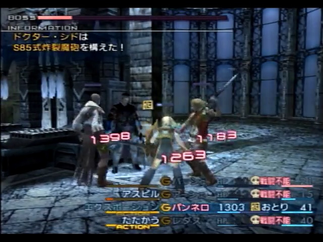 それでもファムフリートを撃退し、残るはドクター・シド一人だから楽勝……と言いたいところですが、まだまだ油断はできません。2体を相手にした時ほど過酷ではありませんが、例えば「S85式炸裂魔砲」によって盾役以外が倒され、そのあとにHPの減った盾役への銃撃でクリティカルが発生するとそこで全滅してしまう恐れがあります。また、「見切り」や「瀕死防御力UP」の効果によりドクター・シドに思うようにダメージを与えられなくなるので、戦闘時間は、前半戦よりもかなり長くなります。