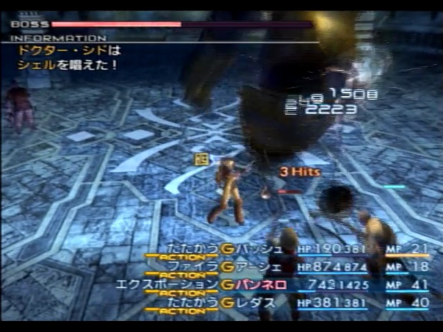 まず初めに、ファムフリートを召喚する前のドクター・シドについて説明します。ファムフリート召喚前のドクター・シドは、敵対心が一番高い相手を狙って銃で攻撃します。武器が銃なので、どれだけ防御を高めてもダメージを軽減することが出来ません(こちらが使用できる銃と同様に、プロテス状態でダメージを軽減可能です)。そのダメージは、こちらの銃と同じ計算式が適用されるとして800〜1000程度のダメージになります。こちらの最大HPがバブルチェーンありで2800程度である事、クリティカルが発生しダメージが2倍になる事を踏まえると、中々の威力となっています。おまけにドクター・シドの銃のCTが15と短く、回復アイテムの演出中に次の銃撃が飛んできますので、ハイポーションではまるで回復が追い付きません。ですので、盾役の回復はエクスポーションでないと追い付けません。
