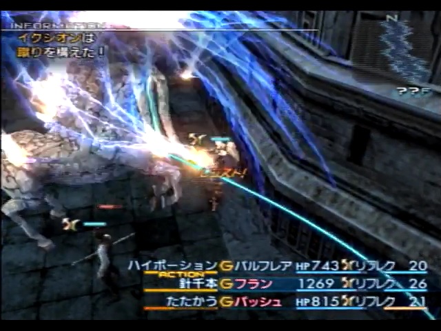 フェニックスの尾 2.「瀕死」の敵 -> たたかう※ 3.自分自身 -> バヒール 4.敵一体 -> たたかう ※「瀕死防御力UP」の効果により「加ダメージチャージ」の回復量が減り、バッシュがバヒールを唱えてMPを消耗しアーシェ達の回収するMPがなくならないようにするためです。 |