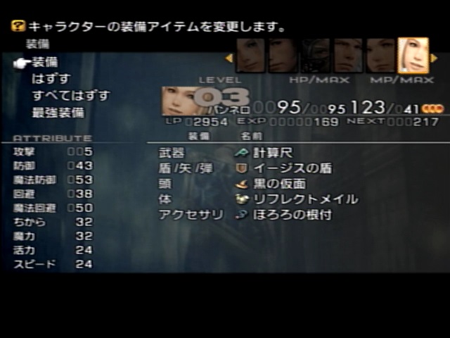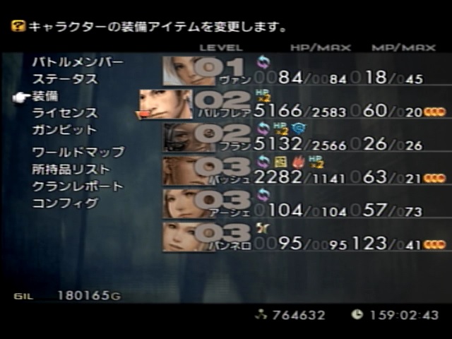 | バルフレア※1 ユークリッド定規/デモンズシールド/ローレルクラウン/ミラージュベスト/バブルチェーン バッシュ※1 最強の矛/魔力のシシャーク/マクシミリアン/インディゴ藍 パンネロ※2 計算尺/イージスの盾/黒の仮面/リフレクトメイル/ほろろの根付 ※1 HPアップライセンス&ミストカート取得済み ※2 ミストカート取得済み |