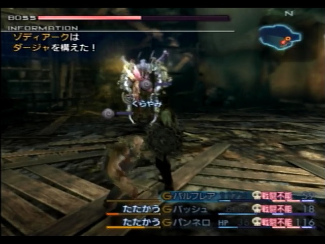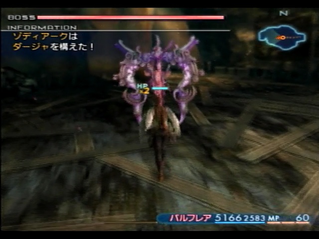 そしてゾディアークの固有魔法といってもよい「パニッシュレイ」は、性能的には即死効果とくらやみ効果のない単体版「ダージャ」といった感じです。この攻撃は闇属性を持っており、「パニッシュレイ」自体をしのぐのは難しくありません。ところがゾディアークはこの「パニッシュレイ」に関連して厄介な性質を持っています。まず、ゾディアークは「パニッシュレイ」を必ず闇属性を吸収しない相手にしか使用しません。つまり、このプレイでは(今まで言及していませんでしたが)禁じ手である装備変更技を使用しなければ基本的に「パニッシュレイ」をモロに食らうことになります。「パニッシュレイ」のダメージはほとんどカンストに近い威力を誇るので、裏技を使用せずに正攻法で耐えるならば、HPを10000以上にするか逆転状態を利用するしかありません。また、ゾディアークは自身が感知している敵の中に闇属性を吸収しない敵がいないと、「パニッシュレイ」の使用をキャンセルし、場合によっては「ダージャ」の使用を早めることがあります。前述の通り「ダージャ」は危険極まりない攻撃であるため、なるべくなら「ダージャ」を使わせないようにしたいところです。ところがこの自身が感知している敵という条件が曲者で、闇属性を吸収しない敵(=こちらから見た味方)が戦闘不能状態だったり、闇属性を吸収するメンバーがおとり状態だったりすると、闇属性を吸収しないキャラクターがバトルメンバーに含まれていてもゾディアークがそのキャラクターを感知できないようです。これに関連して、FF12のモンスターはおとり状態のキャラクターを感知した場合、おとり状態以外のキャラクターを感知できなくなるらしいです。ともかく、闇属性を吸収することばかりに囚われていたり「パニッシュレイ」を受けるはずのキャラクターをゾディアークに認識してもらえなかったりで「パニッシュレイ」の使用条件に反する状態に陥ると、それだけで戦況がつらくなってしまいます。モーション的にも通常攻撃よりもはるかにゆっくりとした攻撃であるため、ゾディアーク戦では「パニッシュレイ」を使用されるような状況を作った方が楽になる場合が多いでしょう。