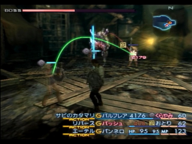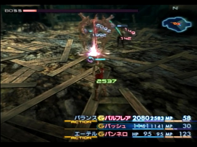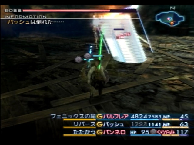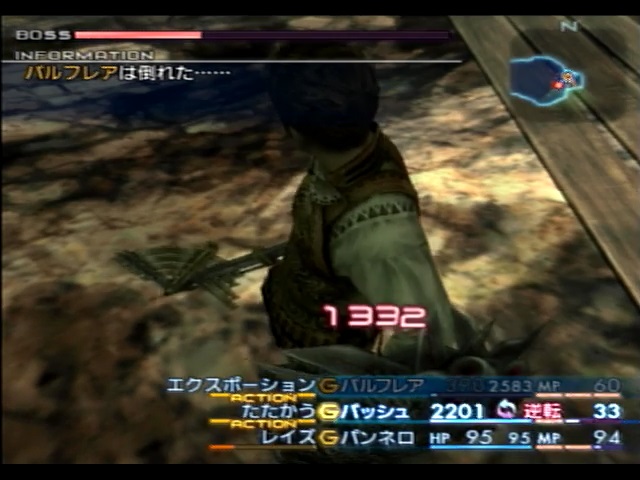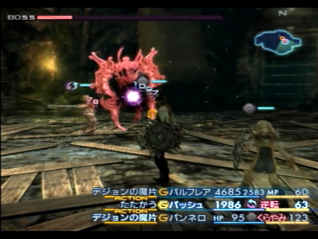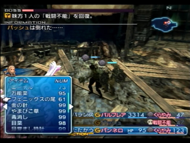 残ったバトルメンバーであるパンネロは、バッシュが使用する「デコイ」「リバース」を代わりに唱えたり、それらの魔法を唱え終わったバッシュのMPを回復するなどの補助に回ります。バッシュの最大MPはミストカートリッジを全て適用しても63しかないため、消費MP35の「リバース」を一回唱えるだけで息切れします。しかもバッシュは最強の矛で攻撃も行わないといけないため、パンネロがバッシュのサポートをメインに行います。