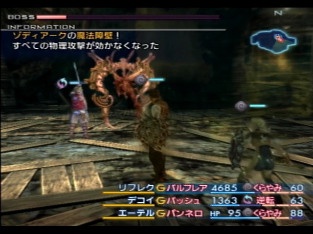 かくして、「バランス」を使用して瀕死状態のゾディアークに魔法命中率マイナス必中を利用してダメージを与えることになりました。しかし、敵はリフレク状態になっておりそのままでは命中させられません。オパールの指輪は前述のインディゴ藍と同じく装備枠的な都合で装備する余裕がないので、ここはデルタアタックでリフレク状態を無視して攻撃します。さて、「バランス」は範囲魔法なので、デルタアタックを行うならば「バランス」の範囲に含まれるキャラクター全員がリフレク状態でないと、リフレク状態ではないキャラクターは当然魔法を跳ね返せずにダメージを受けてしまいます。これまで言及していませんでしたが、パンネロの装備枠に余裕があったので、パンネロはリフレクトメイルを装備し、永続リフレク状態になる事で問題なく「バランス」を反射させることが出来ます。パンネロ自身には補助魔法の類を一切使用しないので、「バランス」以外の面でも困る事はありません。残るバルフレアとバッシュについてですが、彼らの装備枠に余裕がないので、リフレク状態になるのであれば魔法の「リフレク」などを使用する必要があります(リフレガの魔片は入手できないので使用できません)。結論から言ってしまうと、バルフレアだけに「リフレク」をかけてパンネロと2人がかりでデルタアタックを行います。バッシュに「リフレク」を掛けない理由ですが、バッシュに「リフレク」をかけてしまうと、バッシュに「デコイ」「リバース」を使用できなくなるからです。今回は誰もオパールの指輪を装備する余裕がないので、これらの補助魔法を使用したければバッシュのリフレク状態を諦めなければなりません。ちなみに、リフレク状態の敵にこれらの補助魔法を使って跳ね返す戦法は、「デコイ」が敵をターゲットに選ぶことが出来ないので使用できません。以上の事から、既に述べた通りバルフレアとパンネロの2人で「バランス」をデルタアタックする事になりました。なお、これを行うと当然バッシュが「バランス」の魔法を食らってしまうのですが、逆転状態でしのいだり二人と距離を開けたりして対処します。特に二人と距離を開ければ、敵の「コラプス」の被害も散開によって軽減できます。