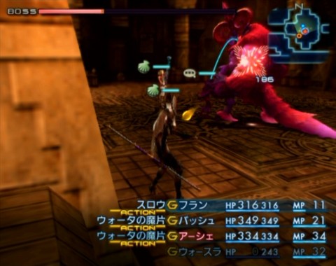 ・・・ということで、使うのは今回も「ウォータの魔片」である。威力が高いのはもちろんであるが、アイテムなので瞬時に発動できるという点が実に大きい。このバトルでは、相手の攻撃によって回復に手が焼かれ、更に今回は「シェル」などの補助魔法まで使わなければならない。そのうえに「ウォータ」を唱えて減ったMPはエーテルで回復・・・などとやっていると、まったく手が回らずに「ファイジャ」で全滅させられてしまう。何だかものすごく魔片でゴリ押しする言い訳のように感じてしまうが、俺もその通りだと思う。しかし、魔片を使わなかった結果、もっと酷い戦い方しか残らないのであれば、それはそれで意味が無いと思うので・・・。