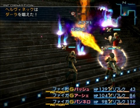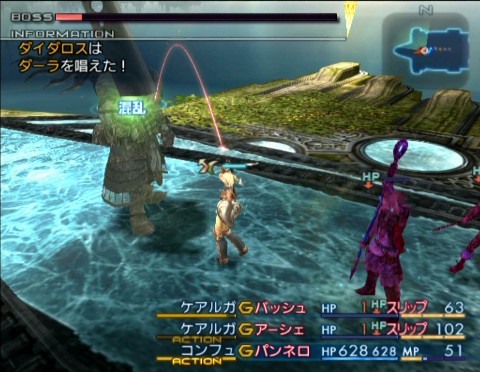 ――が、コイツは混乱が効くという致命的すぎる弱点を持っており、今回プレイではただの雑魚と化してしまう。戦法は、まず全員をリフレク状態にし、パンネロは「インディゴ藍」で「コンフュ」を跳ね返し続けて相手の行動を封じ、残った2人が「ケアルガ」で攻撃する。このゲームの混乱は「入力中の行動をキャンセルして自分に『たたかう』を使う」という性質であり、また相手はHP80%以下で必ず「ダーラ」を構えるが、その前に「コンフュ」によって混乱状態にできるので、「ダーラを構える」→「混乱で行動キャンセル」という混乱ハメで完全に相手の攻撃を封じることができる。そして敵はアンデッドであるため、「ケアルガ」の反射により大ダメージを与えていけるのだ。・・・と、そんな予想通りの戦法が完璧に決まってしまい、前回の強敵であった「ダイダロス」を実に楽に倒すことができた。うーむ、睡眠がチートなのは間違い無いけど、混乱もこれまた強い・・・。