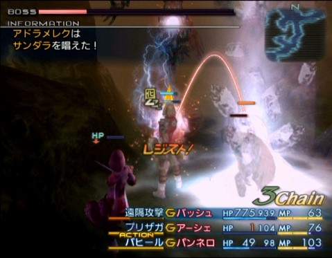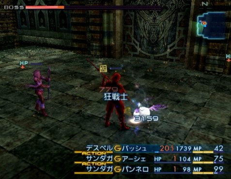 ――そんな「フューリー」は、数々のステータス魔法で自身を強化しながら、「回避無視」によって着実にダメージを与えてくるという能力を持っている。そして、通常攻撃には4%の確率で「狂戦士」の追加効果があり、それが発生すると当プレイの条件下では即ゲームセットであるため、敵の強化ステータスを解除して時間を稼ぎ、また相手の攻撃を盾役のバッシュに集中させるようにする。敵のHPは69710とそこまで高くなく、また火属性以外には特に耐性を持っているということも無いため、「サンダガ」で攻撃しつつ、とにかくもうバーサクの追加効果が発生しないことを祈るのみなのである。