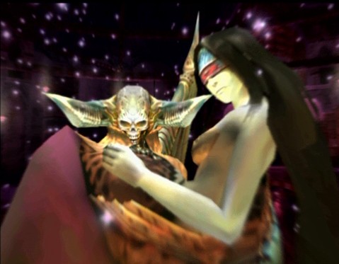・・・ところで、この“死の天使”「ザルエラ」は、骸骨のモンスターが巫女を抱いたような形状となっている。実は、設定としては、ザルエラは「神に仕える巫女を人質として神に戦いを挑んだ」という感じになっており、ザルエラと囚われている女性は敵対関係にある。しかし、作中ではどう考えても愛し合っているようにしか見えないうえに、グラフィック的にはザルエラの右羽と巫女が完全に同化してしまっている。これはもうまさに召喚充としか言いようが無い状況になっているのだ。くそっ・・・!