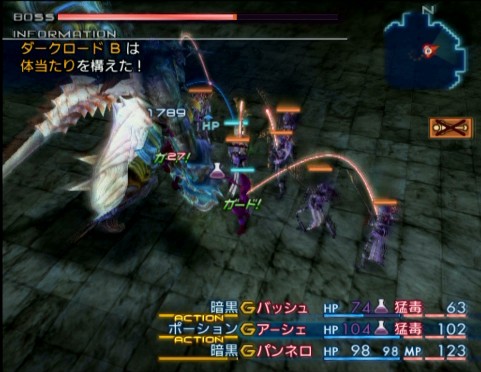 そんなこんなでHPを削っていくと、敵はHP<50%にて「回避無視」と「通常攻撃ダメージUP」を失い、なぜか弱体化してしまう。やれ、FF12では暗闇状態時の命中判定は、「盾・武器・オプションによる回避率が全て2倍になり、最後に単独で『攻撃をミスするか否か』が50%の確率で判断される」というグチャグチャした感じになっているが、このとき回避が50以上の盾を装備していれば、なんと回避率が100%になってしまうため、全く相手の攻撃を喰らう余地が無くなってしまうのである。よく分からないが、「最強の盾」に「『盾強化』ライセンス」まで使える今回プレイでは、雑魚が更に雑魚になると捉えて良いであろう。