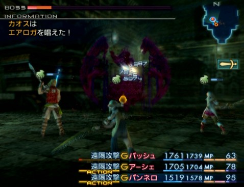 ・・・というのも、カオスは大技として「エアロジャ」という魔法攻撃を使ってくる。この「エアロジャ」では全員が3500という特大のダメージを受けるため、基礎HPが最大1700程度の今回プレイでは、「バブル」無しだと一発全滅が確定してしまうのだ。「エアロジャ」は風属性を持っているのだが、FF12には風属性を“吸収”できる装備品は無く、“半減”の「ポンチョ」もHPが大きく下がってしまうため本末転倒である。「シェル」や「守りの指輪」などを使用しても、絶対に耐えきることはできない。攻撃範囲も円100(ヤズマットの「サイクロン」の5倍)と広いため、位置取りを利用して避けることも不可能だろう。