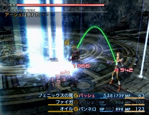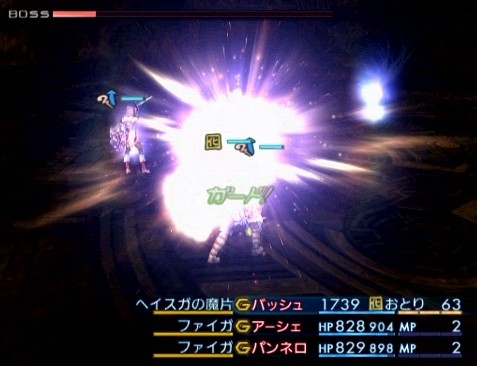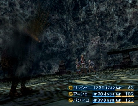 ・・・そんなこんなで、具体的な戦い方としては、敵を「オイル」状態にし、味方は「バヒール」「フェイス」で魔力を高め、装備で味方全体をリフレク状態にし、「ファイガ」を反射させて攻撃を仕掛けていく。魔力の高いバッシュとアーシェは攻撃役で、パンネロはリフレク貫通の装備で戦闘不能からのリカバリーを担当する。ダメージは、だいたい「ファイガ」が8000程度で、通常攻撃ならば1回の出入りでギリギリ4発は当てられる。途中、敵の攻撃パターンが変わっていくため、退出タイミングの分かりやすい「アーダー」に魔法を変えたり、盾役のパンネロに「デコイ」や「リバース」を使ったりしながら、臨機応変に戦っていく。