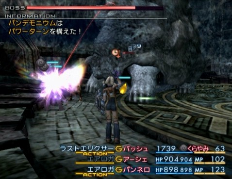 ・・・ちなみに、特徴的なこととしては、アーシェの「プロテガ」がある。これは、このメンバーの中には聖属性を吸収できる人物が1人もおらず、そのままだとバトル開幕の「シャイニングレイ」で確実に一発全滅してしまうため、耐えるためにプロテス状態になっておく必要があるからである。以降のバトルでは、基本的に使用されることはない。その他にも、「エアロガ」の実行順序を工夫していることから分かるように、パンデモニウム戦では「フェイス」を省略することにした。このバトルでは、戦闘不能の他にも、闇神の「デスペガ」によってステータスが解除される場合も存在するため、余分な行動は可能な限り控えていくのだ。