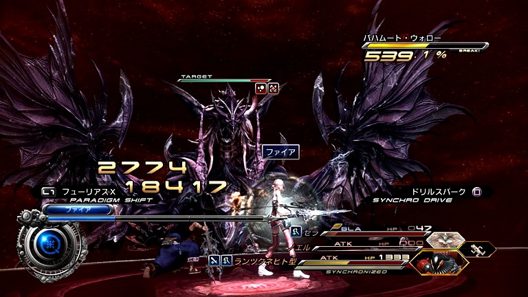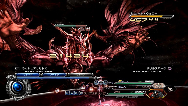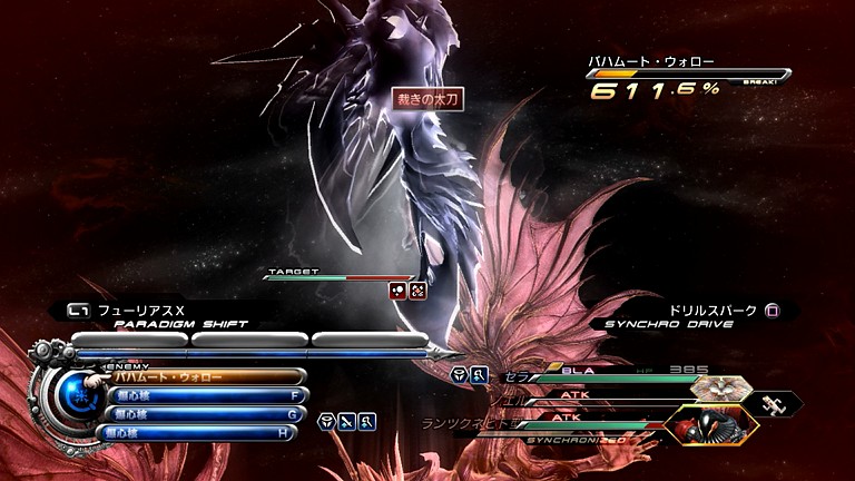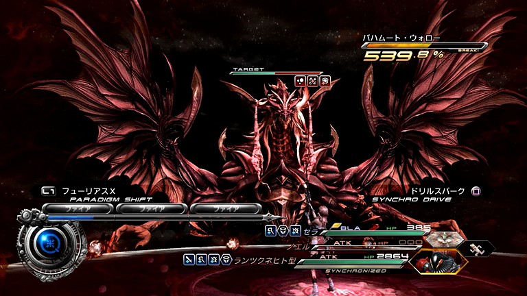 …まず、バハムート・ウォローには「バイオ」のほか、「ウィーク」も有効であるため、それを使って全属性を弱点にし、エン系でコンボ攻撃を行う作戦が極大のダメージを与えることができる。前回プレイではBLA/「ダウンプア」のシンクロドライブでフェイス+エンブリザを掛け、デシェル+ウィーク状態の敵に「ATK+ATK+BLA」で一斉攻撃を仕掛けていったものだった。