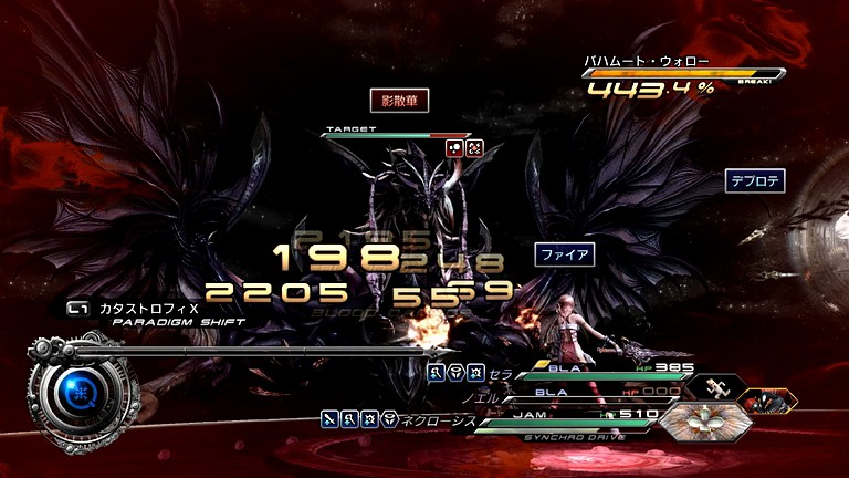 …さて。その戦い方は、基本的には今回最初に戦った時と同じく、敵の「暗天の業火」を「DEF+DEF+JAM」で受け、ピンチ系アビリティの効果を得ながらブレイクを目指す…というものなのであるが、大きく異なるのは、「ATK+BLA+JAM」×2ではなく、「BLA+BLA+JAM」と「ATK+ATK+JAM」の2つにバッサリ分けたということである。つまり、序盤は「BLA+BLA+JAM」で素早くチェーンボーナスを伸ばし、中盤以降からは「ATK+ATK+JAM」で粘りつつ弱体化を行おうという計画である。なにせ、本バトルでは、「バイオ」「ウィーク」「デプロテ」の3つのステータス魔法を、素早いとは言えないネクローシスで入れていかなければならないのだ。効率良くやっていかなければ、いくら時間が有っても足りない。