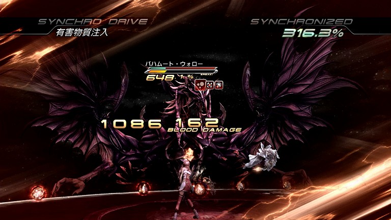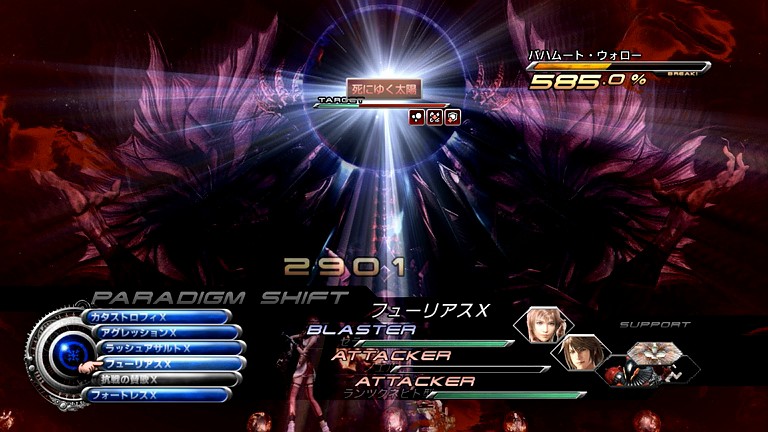 そんなこんなで。バハムート・ウォローの次の攻撃は、思った通り「死にゆく太陽」であった。もちろん、既に掛けておいた「リレイズ」で耐える。実戦では、ここの技のモーション中に「有害物質注入」を入力しようと焦ってしまい、無意味に「DEF+BLA+HLR」に変えてしまったりもしたが、そもそもまだこの時点ではネクローシスのシンクロゲージが回復していなかったので意味は無かったようだ…。