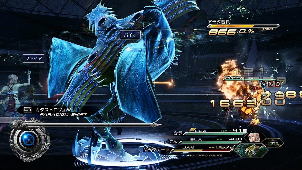 ――そして今回バトルでも、サモヴィーラの「ウィーク」を使えば敵に弱点属性ができるため、ライトニング得意の属性攻撃でどんどん相手のHPを削っていける。1発の威力はそこまでではないものの、6回攻撃できることを考えればその攻撃性はオメガ以上だ。そして、仮にブレイク中に仕留め損ねたところで、今回は「シーンドライブ」で稼いだチェーンボーナスを使ってアモダ曹長にバイオ掛けているため、相手のHPを確実に削っていけるのだ。