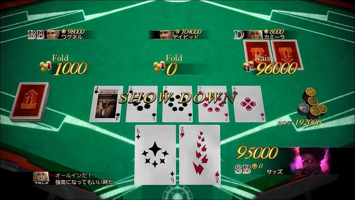 ――ちなみに、そのやり方も特に難しいものではない。まず、使用するのは「ザナドゥ・ポーカー」のほうであり、「コール」でカードを3枚呼んだ後に、強い役が出来そうなら「オールイン」で勝負、そうでなければ降りれば良いだけである。これで、失敗してもリセットしてやり直せば良いし、成功すれば一気に相手を破産させて1人につき10万枚ものコインが手に入る。なお、3人全員を破滅させると更に+20万枚のボーナスが付くが、狙いすぎると時間が掛かるうえに失敗した時のリスクも大きいため、個人的には10万枚単位で稼げたらすぐにやめることをお勧めしておこう。