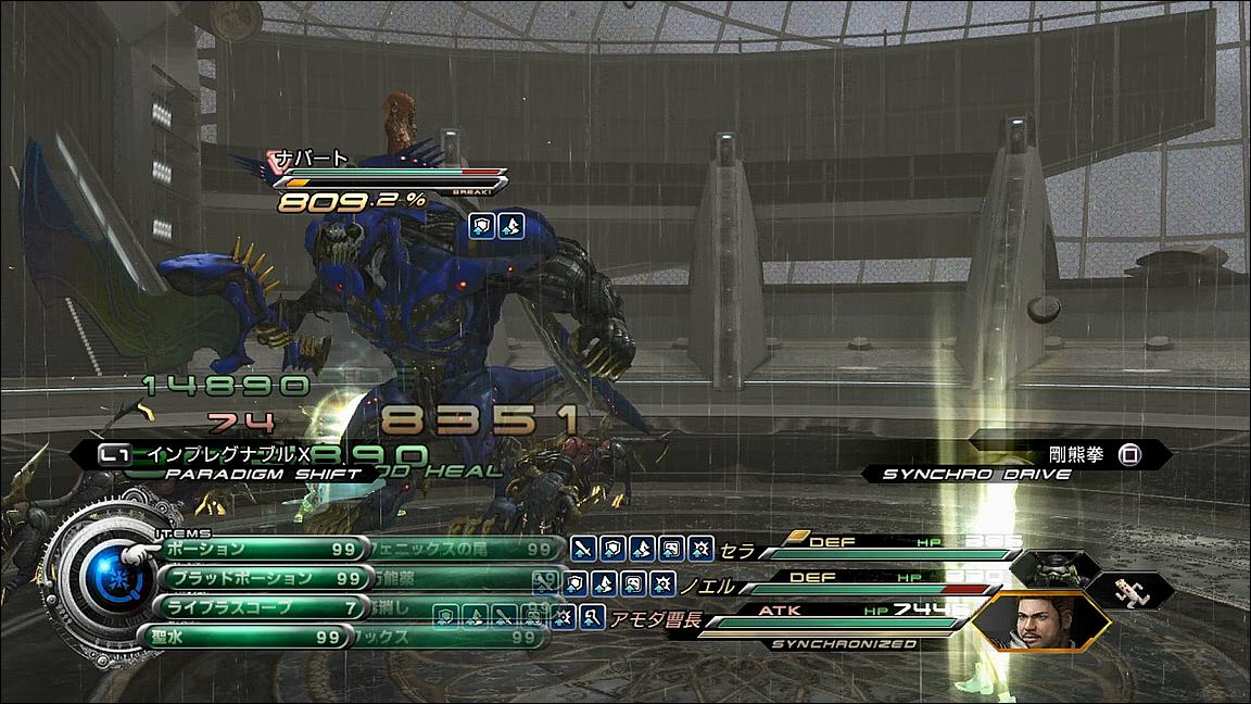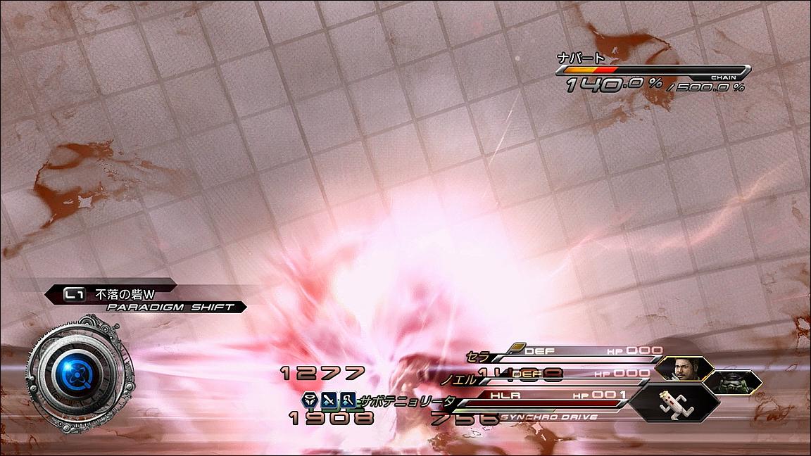 では、前置きが長くなったが、今回の敵である「ナバート」戦の攻略に行ってみよう。ナバートと言えば、前作の『13』で登場した聖府軍人の女キャラクターであるが、これと言った活躍の場面も無いままバルトアンデルスに不用決定されて死んでしまった。また、ストーリー上ではサッズ親子と浅からぬ因縁があるが、その決着も付けられることなく退場し、後に回想されるようなことも無い。そして、通底した敵側のキャラクターとして登場するが、武人として聖府への忠義を貫くどころか、むしろ私利私欲のために行動する残忍な人物として表現され、物事が思い通りに行かずに狼狽する様子すら描写されていた。ナバートさんお勧めのアレはアレか。SSか。