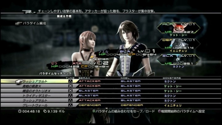 その「モンスター」のバトルでの具体的な立ち回りは、まずモンスター枠は3人目のキャラクターとして登場し、パーティ全体のパラダイム(オプティマ)と同時に切り替えながら戦っていく。登録できるモンスターは3体までである。そしてモンスターは、それぞれのロールとアビリティに合わせて行動をしていくのだ。なお、モンスターの能力値の「HP」という欄は冷静に考えてみると意味不明であるが、これはどうやら「比率」として各モンスター間でHPが共有されるらしい。・・・ふーむ、なんか悪巧みができそうな気がしないでもないが、まあそれは今後必要になってから考えていくことにしよう。