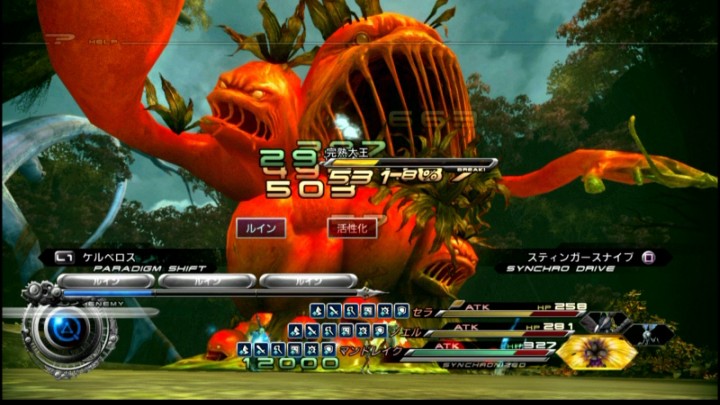 さて、この「完熟大王」戦は、「章の入り口という登場場所」と「コミカルな外見」からお笑いバトルと思われがちであるが、その実は全体攻撃を使いこなし、そして「活性化」によってものすごいスピードでHPを回復していく強敵である。まあ、攻撃力のほうは大したことが無いのだが、しかし回復力ペースのほうは問題で、クリスタリウム封印下の火力ではブレイクさせてやっとHPを減らせるかどうかというレベルになっている。ここも、前話の「カイアス」戦ほどでは無いが、13-2のクリスタリウム封印プレイヤーたちにとっては静かな難所として知られているようだ。