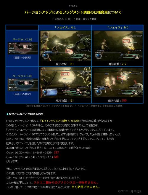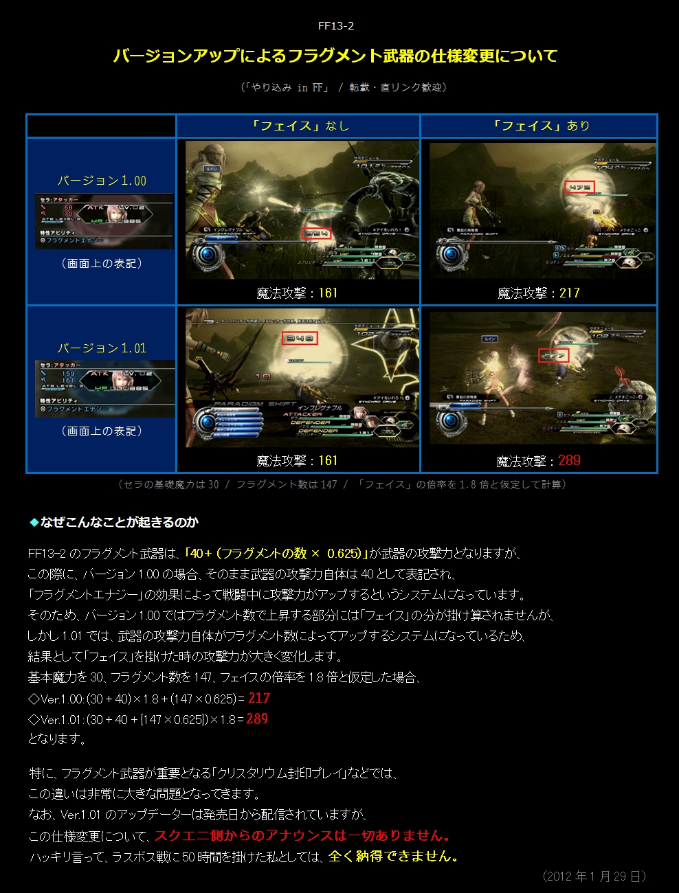 というわけで、スクエニ側の解釈がどうであれ、事実としてバージョン1.00と1.01では驚くほどにゲームバランスが異なるため、この「フラグメント武器」に関する仕様変更は、「やり込み」というレベルにまでゲームを楽しまれる皆さまにとっては、必ず知っておいていただきたい事実です。この仕様を知らずに、「フラグメント武器」を使用したやり込みプレイを行われるようなことがあれば、必ず残念な結果となるでしょう。