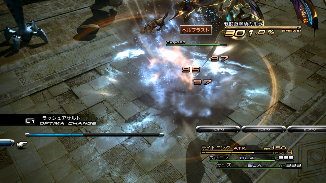 …さて、この戦闘は2連戦となり、2回目のバトルに勝った後に、バトルリザルトが表示される。というわけで、一般的なFF13のバトルとは異なる特徴があり、その認識が誤っていると良いタイムは出せない。ということで、以下に細かい性質を調べてみたので、軽くまとめてみたいと思う。