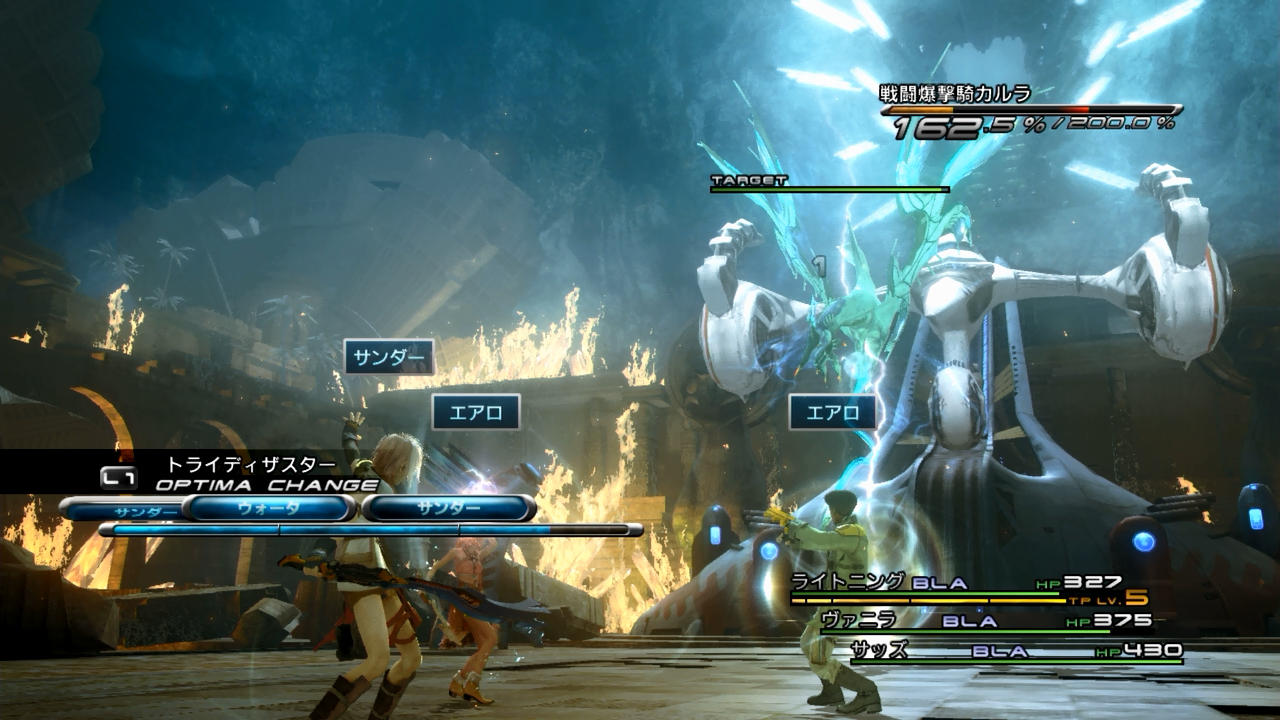 ――そしてその後も、敵は通常攻撃によって何度もこちらを転倒させようとしてくるのだが、ここからは「ATK+BLA+BLA」で、物理特化のライトニングが「たたかう」を入力していく。というのも、どうやら敵は繰り返しライトニングを狙ってくるようなので、空中戦を挑めばヴァニラ・サッズが巻き込まれることはなく、しかもライトニングも転倒しないのだ。更に、ライトニングが空中に居る間はオプティマチェンジの初回演出が先送りとなる。もはやメリットまみれである。というわけで、ライトニングが重力を自在に操りつつ戦い、ブレイクしてさっさと1戦目を終わらせていく。