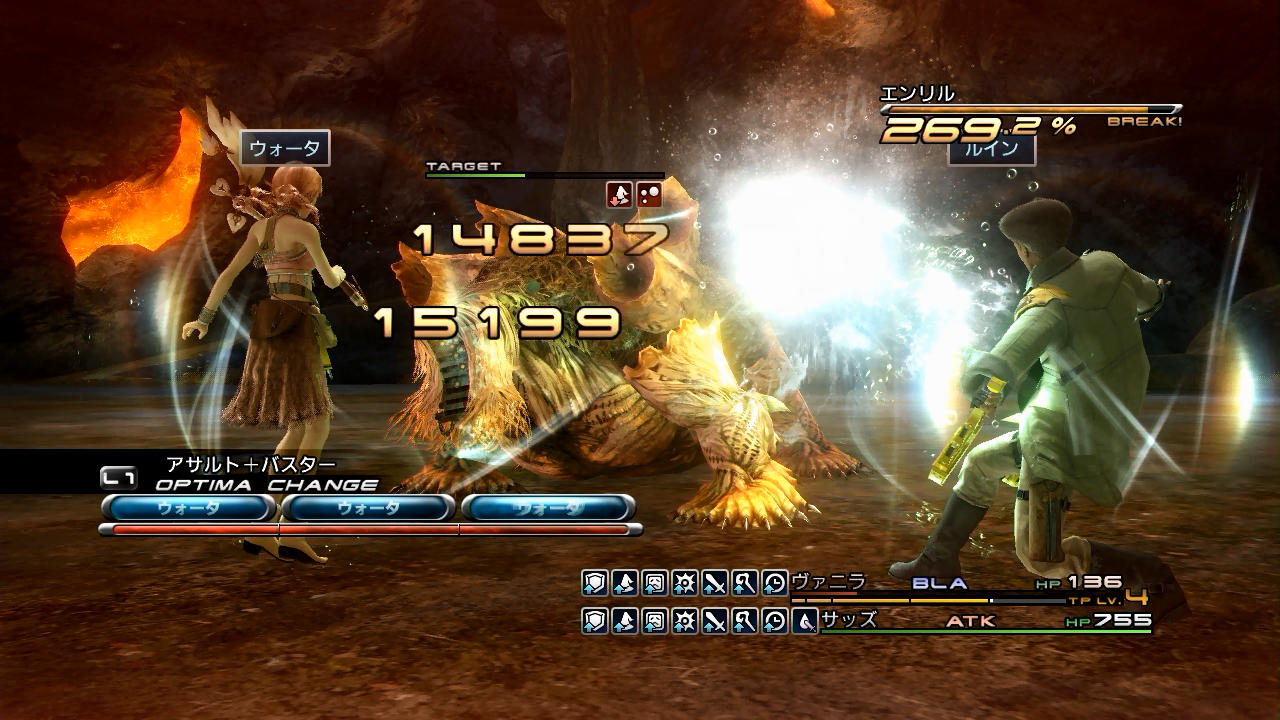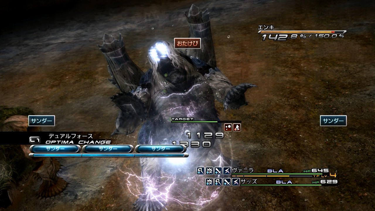 …まず冒頭であるが、敵のライブラ情報を解禁していないとサッズはエン系を使ってくれないため、ヴァニラはすぐに「ライブラスコープ」を使用する。そして、サッズが2名分の「エンサンダ」(最初は右のエンキにターゲットが合っているため)を配ってくれている間に、ヴァニラは「クエイク」を使用する。FF13では、TPアビリティを使っている最中はオプティマチェンジできないという仕様があるのだが、その時間的ロスを、サッズのエン系を掛ける時間と重ねることで相殺しているのだ。ちなみに本バトルでは、ここで稼いだチェーン時間を最後まで使用している。