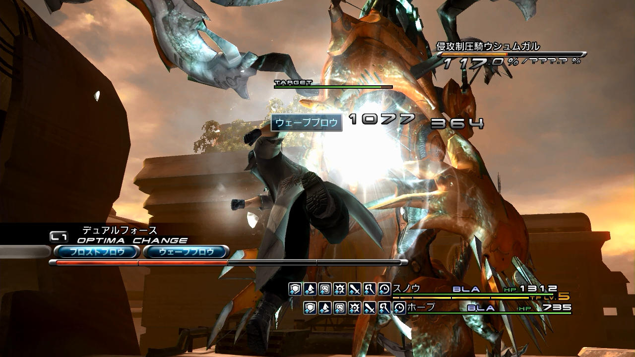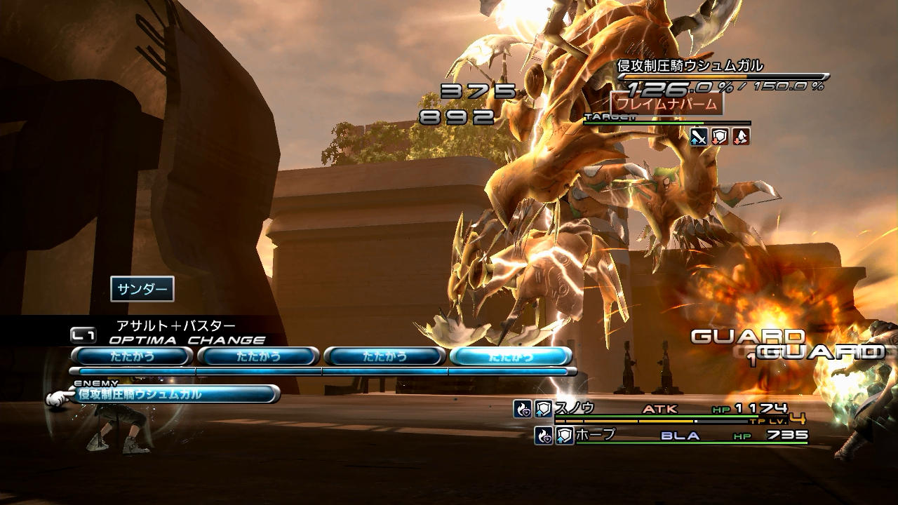 そんなわけで。しばらくイベントを見ながらストーリーを進め、7章が中盤から終盤に差し掛かるような場面で、第1のボスである「侵攻制圧騎ウシュムガル(1回目)」と戦うことになる。パーティは、スノウ+ホープである。