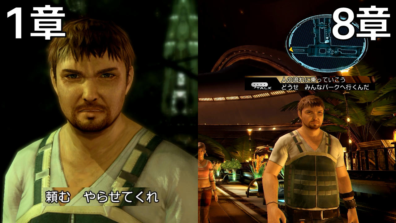 ――あと、書く場所が無かったのでここに書くのだが、8章の道中では、1章でスノウに対して「頼む、やらせてくれ!」と発言し聖府との戦いに熱意を示していた通称:やらせてくれおじさんの生存が確認できる。その発言から、パージのことはさっぱり忘れて、ノーチラスでの楽しい時間を満喫しているようだ。いや、まあ要するにモブキャラの使い回しなんだろうけど、ここまで特徴的な見た目をしているとやっぱり同一人物説を疑ってしまうよね…。
