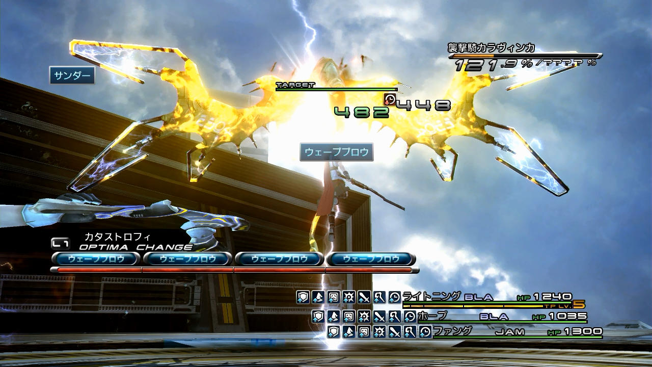 そんなわけで。戦法としては、まずライトニング・ホープ・ファングの「BLA+BLA+JAM」でチェーンを伸ばす(この際、ライトニングは手動で「ウェーブブロウ×4」を入力する)。そして、空中で「ATK+BLA+ATK」に変え、ライトニングは「ルイン×4」を入力して一斉攻撃である。これだけであるが、敵のチェーン耐性は極めて低く、ライトニングの攻撃性がとても高いため、あっという間に108000のHPを削ることができるのだ。