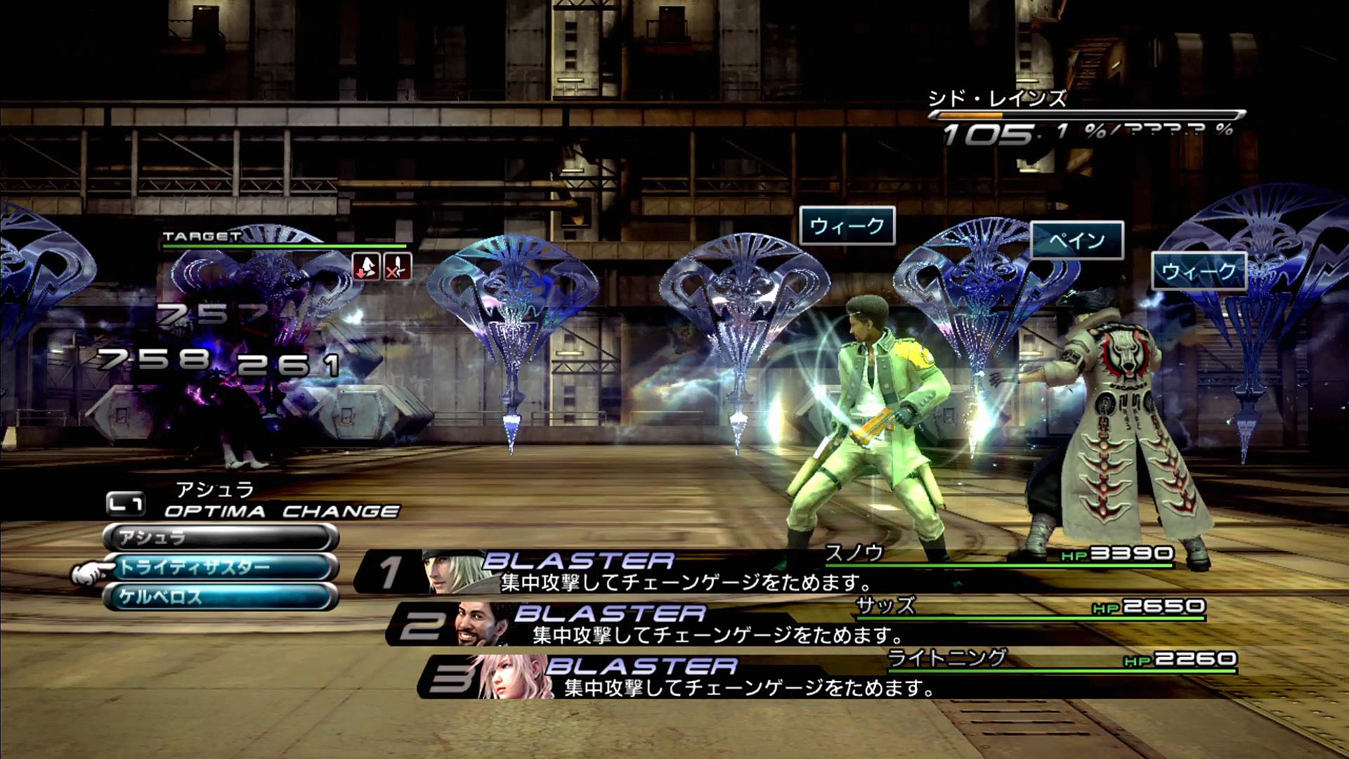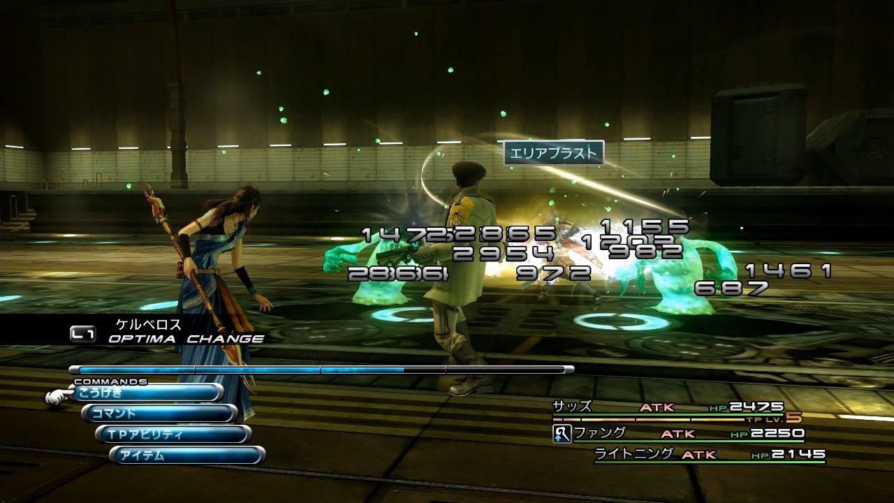 …次に、2ターン目として、サッズが連続攻撃をできるタイミングで「BLA+BLA+BLA」に変える。この際、初回オプティマチェンジ効果による長演出が入り、バトルの流れに大きな悪影響を与えるのだが、これはFF13の仕様ということで、我慢するしかない。そして、全員BLAでの攻撃を加えていくのだが、この際、スノウは2発だけ魔法を加えて待機とする。理由は、スノウまで全力で攻撃すると、HP60%のラインを乗り越えて、相手に「メタモルフォーゼ」を使われてしまうからである。これにより、試行時は、せっかくステータスを全て入れたにも関わらず、何度も失敗してしまった。