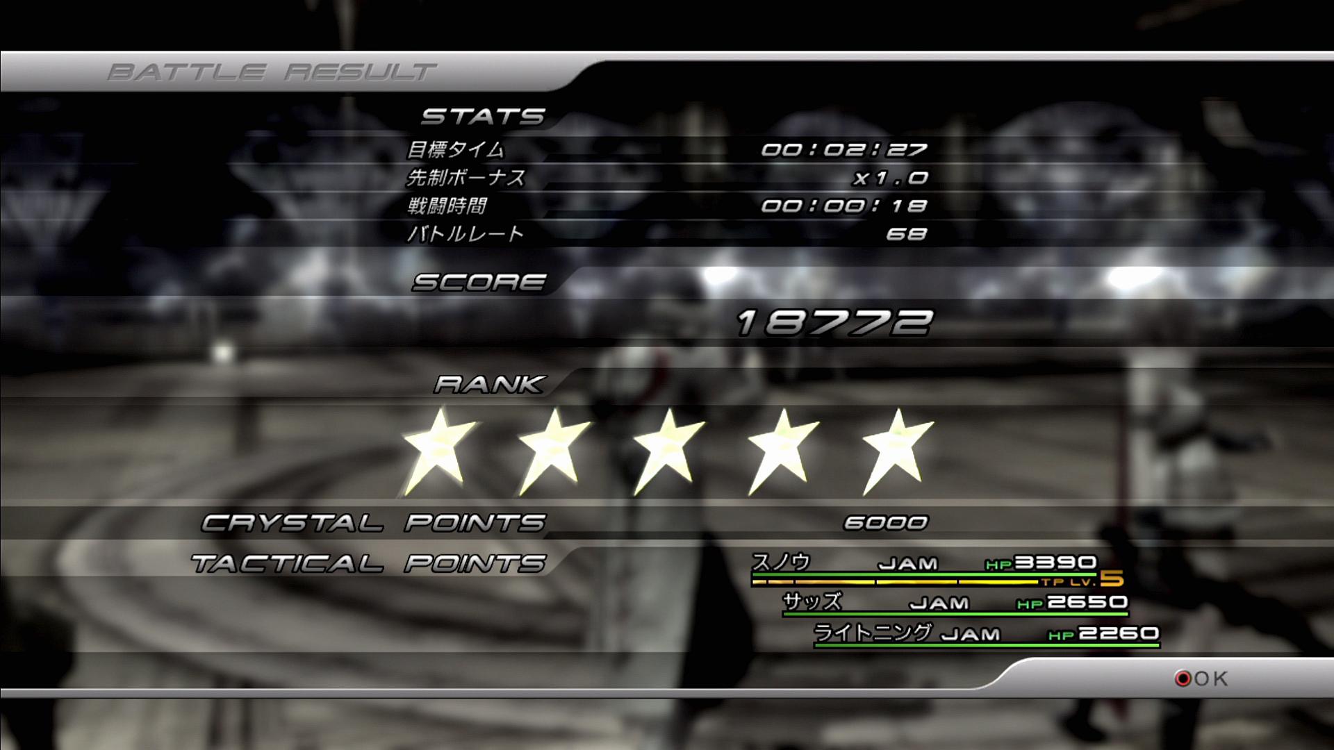 …そして、18秒より短いタイムとなると、3ターン撃破のまま行動を改善するか、または頑張って2ターン+αくらいまで縮めるかという感じであるが、JAMの行動がカギになるということで、どちらも極めて苦しくなると思われる。例えば、初手を「JAM+BLA+BLA」として、リーダーが味方の行動前にデシェル・ウィークを決め、敵の打撃を何とかして打ち上げられないようにし(何故か稀に打ち上がらないことがある)、そのまま「BLA+BLA+BLA」で攻撃する、などという手を考えてみたりもしたが、火力が足りない可能性が高く、実現性があるかは微妙なところである。その他、メンバーについても、今回はATBレベルが4である3人を選び、3ターンで倒せるとして深く検証しなかったが、ひょっとしたら他のキャラを使う余地があるかもしれない。