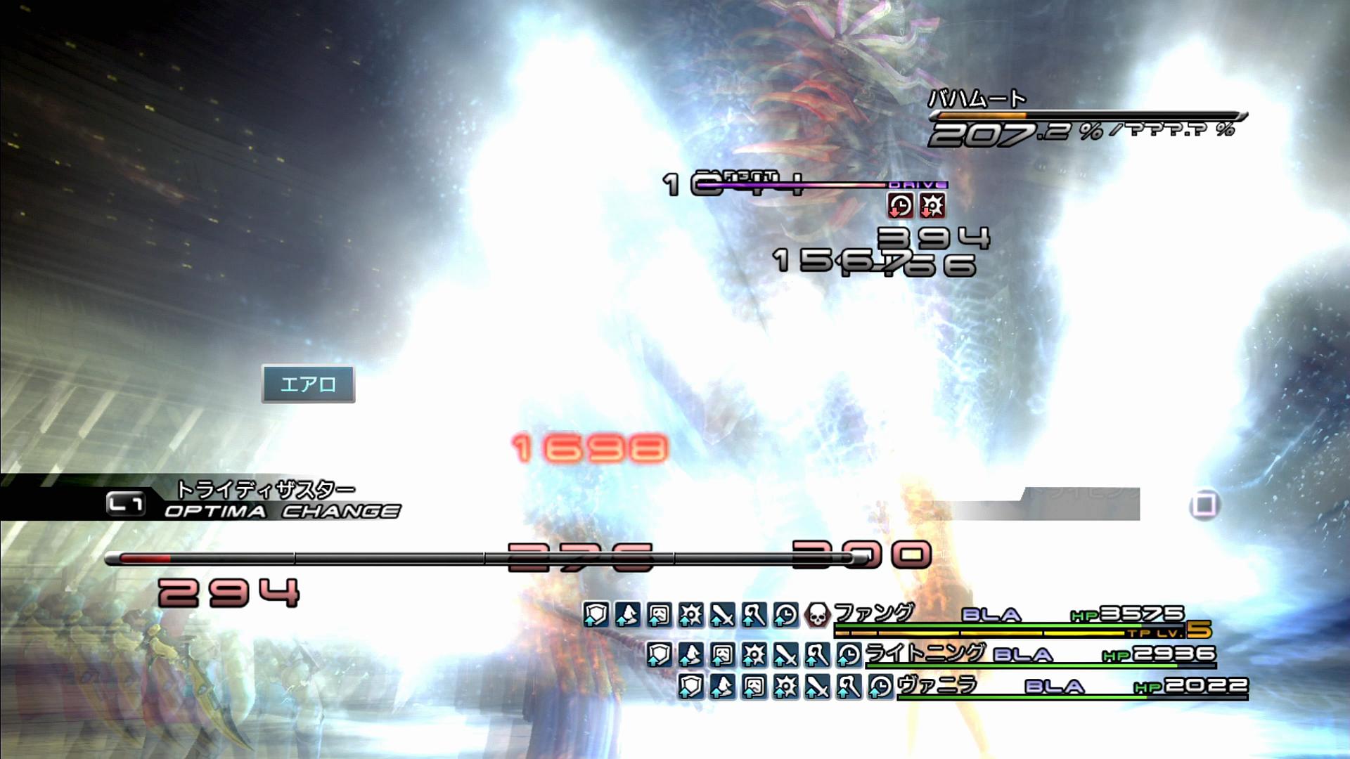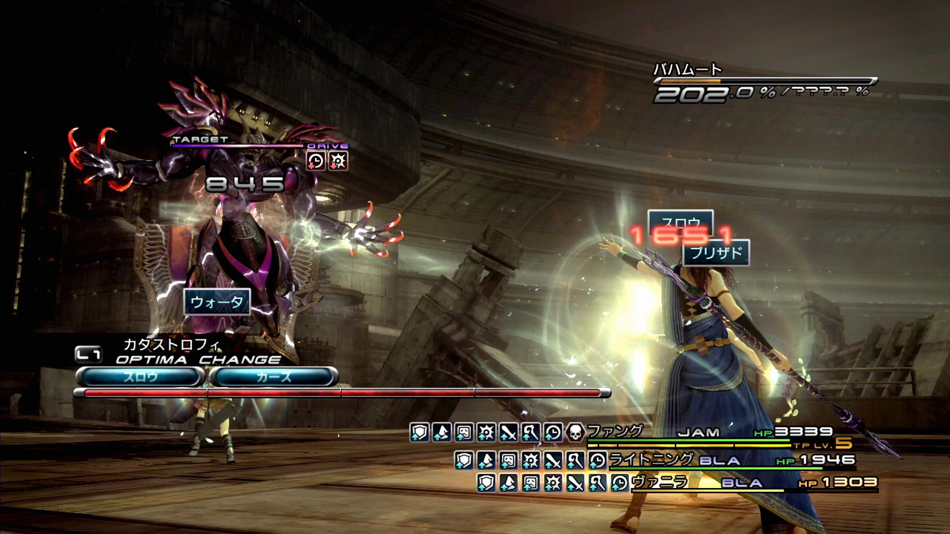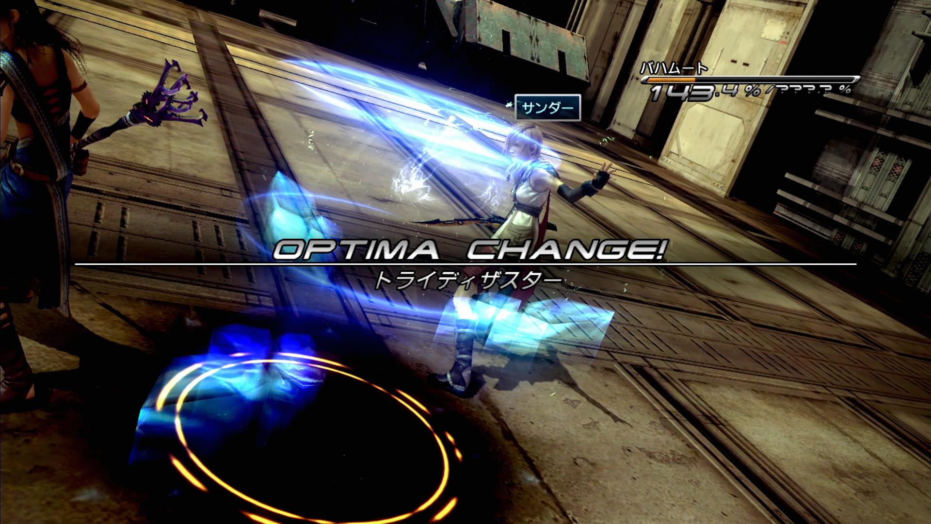 ――また、戦闘では、メンバーがファング・ライトニング・ヴァニラの3人に入れ替わり、自動的に6つのオプティマが用意される(戦闘前からファング・ライトニング・ヴァニラのパーティでも、再編成が発生する)。が、その内容は、「ATK+BLA+BLA」「ATK+BLA+HLR」「DEF+ATK+BLA」「DEF+HLR+HLR」「JAM+ATK+BLA」「JAM+ATK+HLR」という、この戦闘が召喚獣戦であることを忘れているようなラインナップのため、このままで戦うのは効率が悪い。ということで、リスタートして2回目以降に挑もうとすると、戦闘前にメニューが開けるため、そこで「ファングのDEFで守りつつ、隙を見てJAMでスロウとカーズを決め、ライトニングとヴァニラがBLAで攻めていく」という感じのオプティマを組むと良い。それでも勝てなければ、パワー&バリアスモークを使えば、女3人パーティの「ENHが無い」という弱点を埋める形となり、バトルは非常に簡単となる。その他、物語だけを進めたいという場合、今なら「イージーモード」を使うという手もあるだろう。