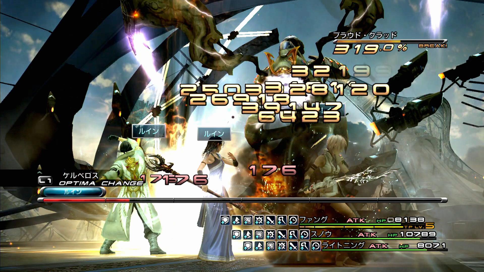 まず、私が最初に試したのは、ダハーカ戦とバルトアンデルス(2回目)戦で採用した、ファング・スノウ・ライトニングの3人が魔法で殴る作戦である。3人ともモーションが速いうえ、スノウとライトニングは速度が一致しているため、“オプティマチェンジ後の連続攻撃”を2人同時に成功させることも可能である。アビリティとしても、ファングENHの「フェイダ」やライトニングENHの「エンファイ」にライトニングJAMの「デシェル」「ウィーク」など、タイム短縮に必要なものが揃っている。唯一の欠点として、ライトニングATKに「ハイボルテージ」が無く、与ダメージがやや低いことが挙げられるのだが、それをもって余りある利点が存在するのだ。