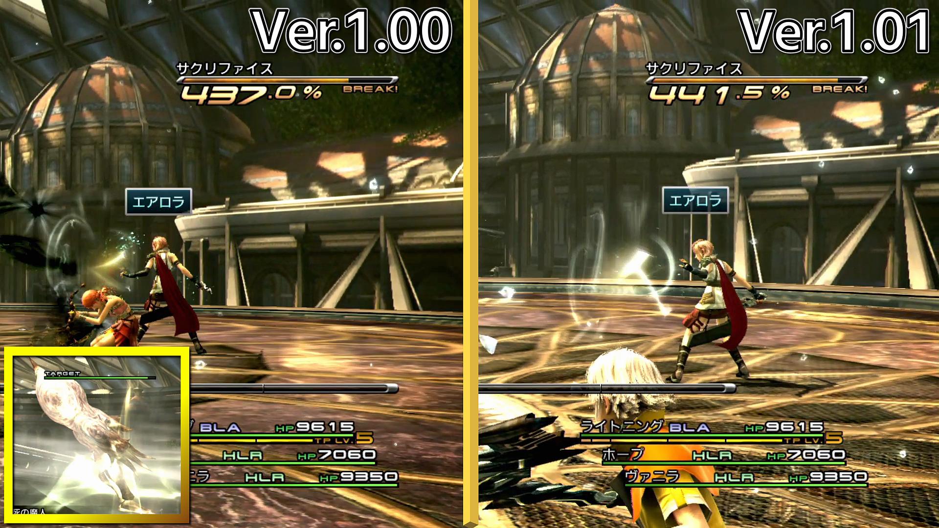 …では、この情報が、FF13のプレイにどのような影響を与えてくるのだろうか。それは、そこまで影響が無いように思える。私は、アップデートが配信された2011年7月から10年近く、この変更について、全く気付いていなかった。攻略本に書かれているのは、Ver.1.00でのデーターであり、それを当然正しいとずっと考えて、疑いすらしなかったのだ。そんなわけで、このエアロ系に為されていた弱体化補正の撤廃が、プレイに大きな影響を与えることは無いと言える。このタイムアタックプレイにおいては、最初からVer.1.01を適用しており、ずっと強化後のエアロを使っていたということになるため、やり直しによって即座にタイムが縮まることもない。