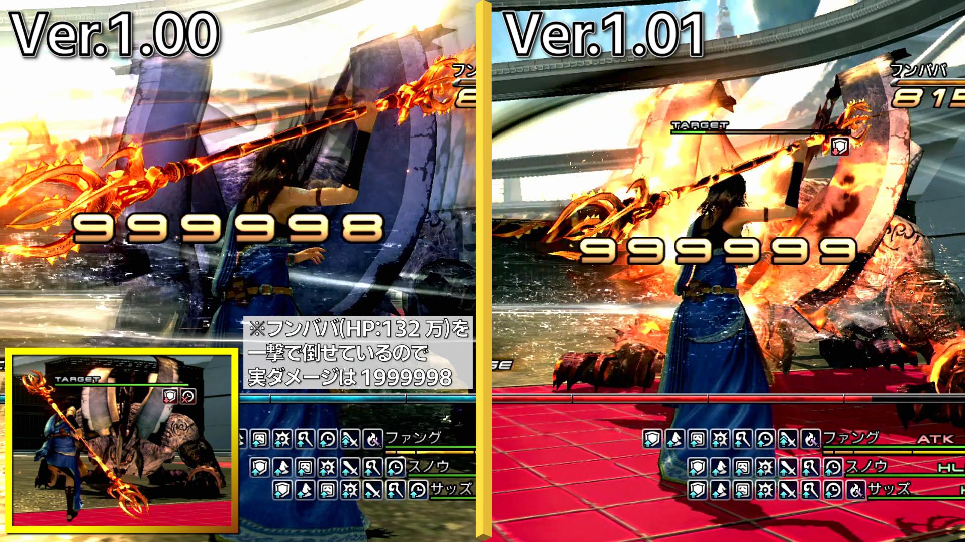 さて。その検証の結果は、冒頭に載せた画像の通りである。Ver.1.00では、「999998」という怪しい数字が出ているが、これでHP132万のフンババを一撃必殺できており、実際のダメージは1999998になっていると思われる。このダメージ数値自体が、6桁までしか想定されていないのだろう。いっぽう、Ver.1.01では、「999999」と表示されており、フンババのHPが残ってしまっている。明らかに、実際のダメージが変化しているのだ。