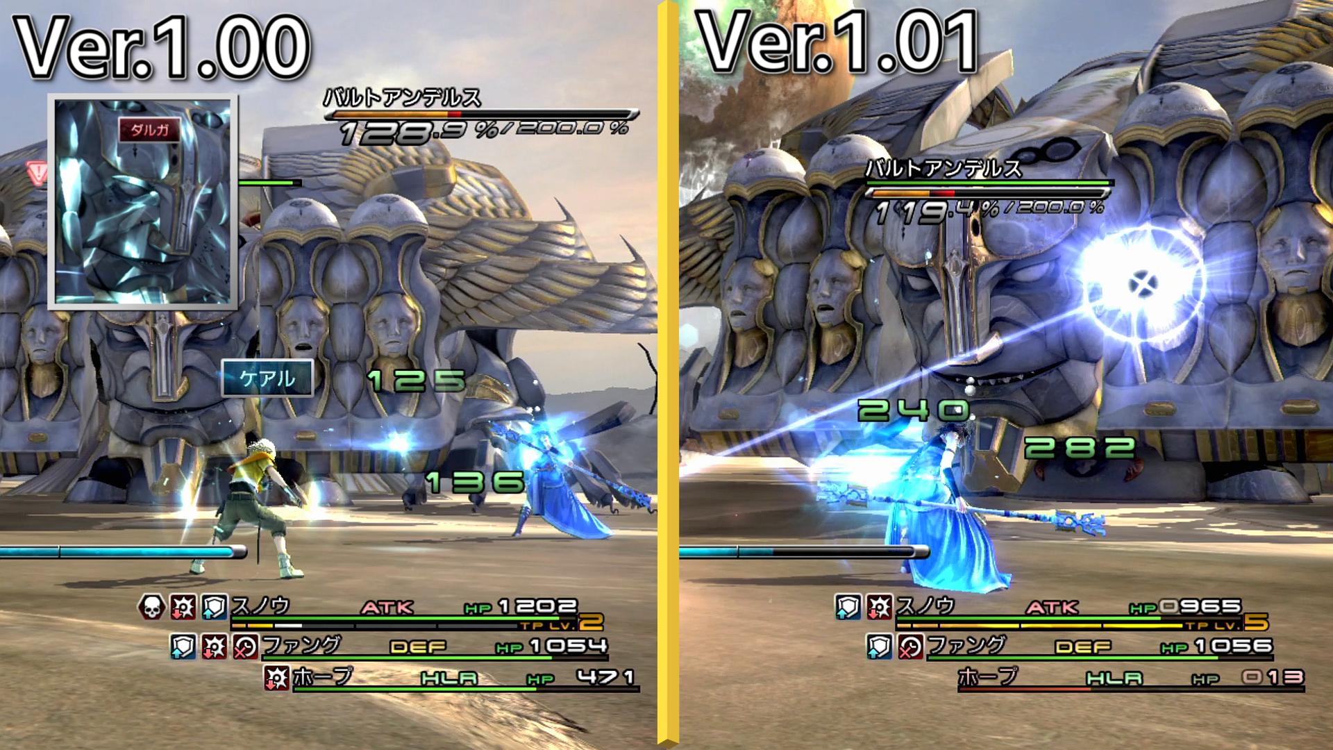 …その内容は、上の図の通りである。Ver.1.00では、ダル状態の味方を「ケアル」などで回復しても、特に通常と変化はないが、Ver.1.01では、回復量が2倍になる。ちなみに、この「味方のHP回復行動」によって、ダル状態が解除されることはない。敵側の回復については調べていないが、まあ味方が有利になる仕様変更と捉えて良いだろう。