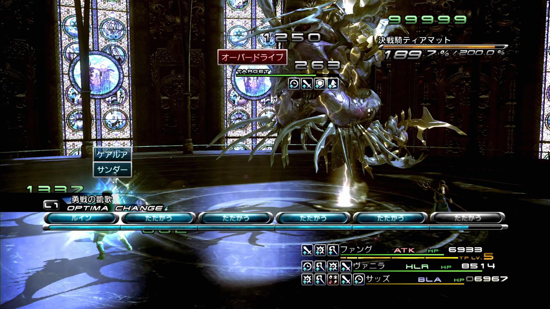 さて。2つの行動パターンについて、具体的に触れてみよう。敵の初期状態は飛行形態であり、この状態では、合計20%程度でスロウの追加効果を発生させる「アイスグレネード」を主力としながら、強力な「テイルクラッシュ」で打ち上げを行ってくる。そして、ブレイクまでに時間を掛けすぎると、「オーバードライブ」を使用し、HPを99999回復した後に、自分をヘイスト+ブレイブ+プロテス+シェルで強化して攻撃してくる。ということで、こちらの戦い方としては、「ヘイスト」などをENHで発動させつつ、できるだけ多くのBLAを投入し、早期にブレイクを狙っていくのが良いだろう。