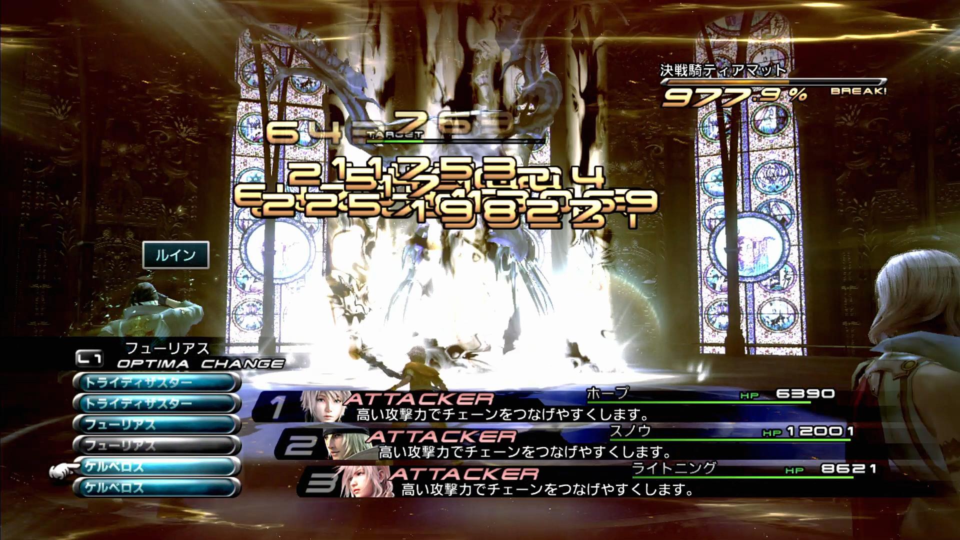 …このチームの特徴として、まずホープBLAの固有技である「ラストリゾート」は、サッズ・ライトニングのそれよりもモーションが速い。また、ライトニングがライオンハート系統のランク3武器を装備しており、「早期ブレイク」を使用可能である。敵にブレイク予兆が発生するのは、200.0%に対して192%程度であり、早期ブレイクではその僅かな部分しか短縮できないのだが、この僅かな差で2回目のラストリゾートがブレイク後に命中するため、ブレイク後のチェーンボーナスで言うと、80%ほどは異なってくる。これは、その後に撃つ「ルイン」のダメージが、全て6000ほど変化するのに相当する。「ラストリゾート」による攻撃も加えると、ダメージ量で35万くらいは変わるだろうか?